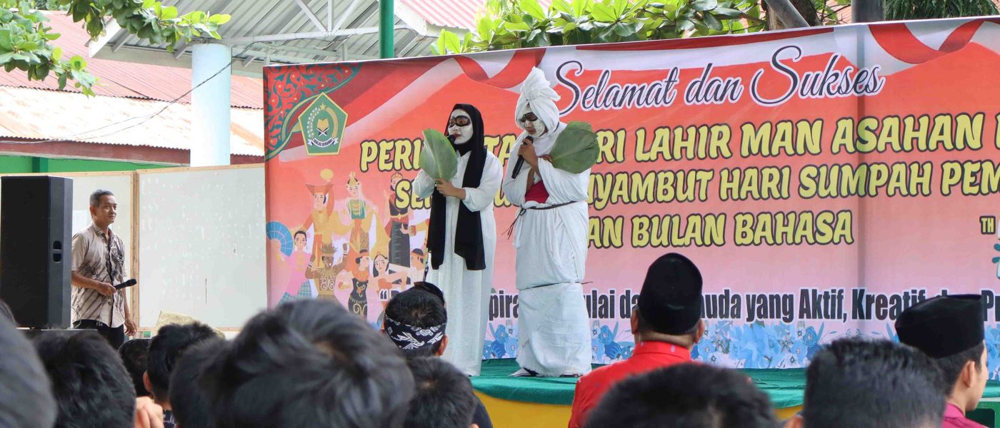 Kisaran (Humas). MAN Asahan menggelar kegiatan peringatan Bulan Bahasa dalam rangka menyambut Hari Sumpah Pemuda di lapangan aula terbuka madrasah, Sabtu (25/10/2025). Kegiatan ini digelar atas gagasan para guru Bahasa Indonesia MAN Asahan untuk menumbuhkan kecintaan bahasa dan budaya Indonesia serta mengenal Hari Bulan Bahasa yang diperingati setiap tanggal 28 Oktober.