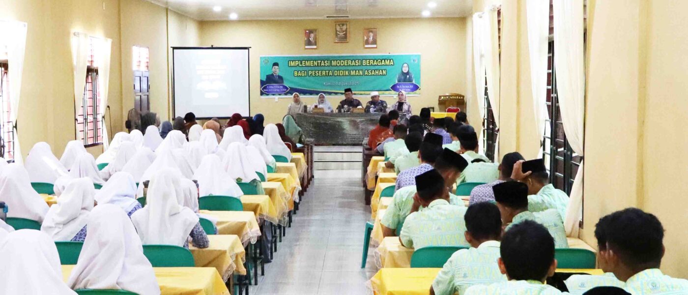 Kisaran (Humas). Madrasah Aliyah Negeri (MAN) Asahan menggelar kegiatan Implementasi Moderasi Beragama Bagi Peserta Didik sebagai bagian dari upaya mendukung program prioritas Kementerian Republik Indonesia. Kegiatan tersebut diselenggarakan di aula MAN Asahan, Kamis (12/6/2025) dan dihadiri oleh Kepala Kantor Kementerian Agama Kabupaten Asahan H. Abdul Manan, MA beserta Kepala Seksi Pendidikan Madrasah Kemenag Asahan Dr. Hj. Srie Muchlis, S.Sos, M.I.Kom.