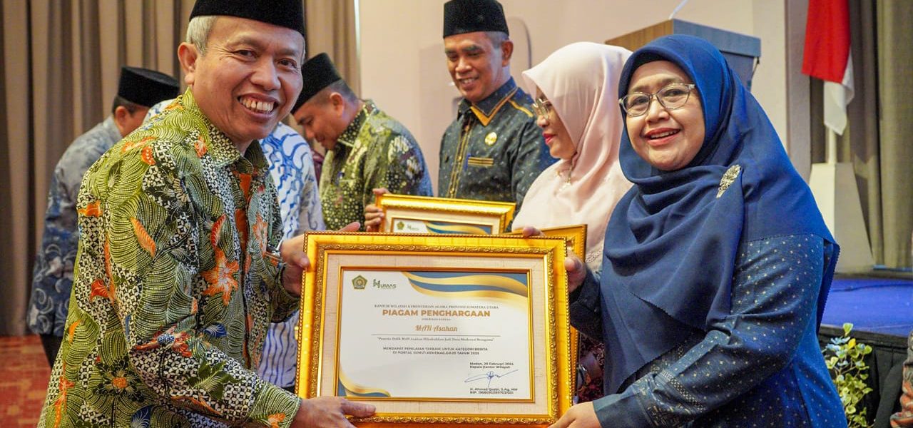 Penghargaan tersebut diserahkan oleh Sekretaris Jenderal Kementerian Agama Republik Indonesia Prof. Dr. H. Nizar, M.Ag kepada Kepala MAN Asahan Dra. Hj. Elda Ayumi, M.Si pada rangkaian kegiatan Rapat Kerja Wilayah Kementerian Agama Provinsi Sumatera Utara Tahun 2024 di Wing Hotel Kualanamu, Kamis (22/2/2024).