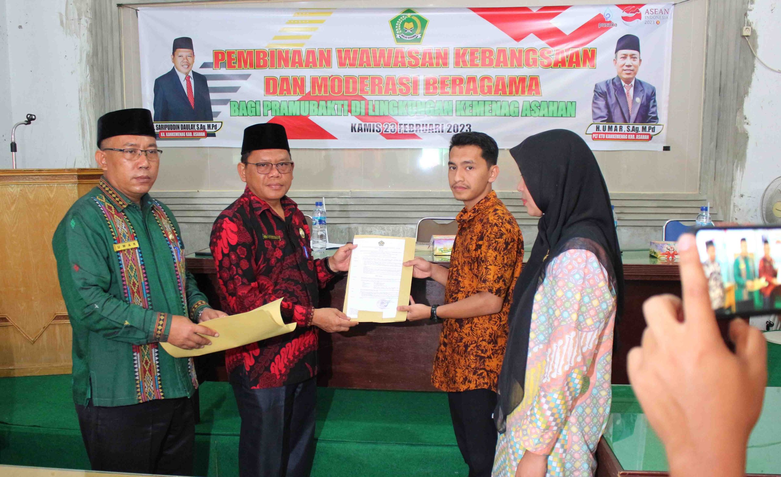 Kisaran (Humas). Kantor Kementerian Agama Kabupaten Asahan menggelar kegiatan Pembinaan Wawasan Kebangsaan dan Moderasi Beragama Bagi Pramubakti Di lingkungan Kementerian Agama Kabupaten Asahan, sekaligus penyerahan Surat Keputusan (SK) Pengangkatan Pramubakti (Pegawai Tidak Tetap) dan Guru Tidak Tetap (GTT) Tahun 2023 kepada seluruh pegawai dan guru Non ASN di lingkungan Kementerian Agama Kabupaten Asahan.