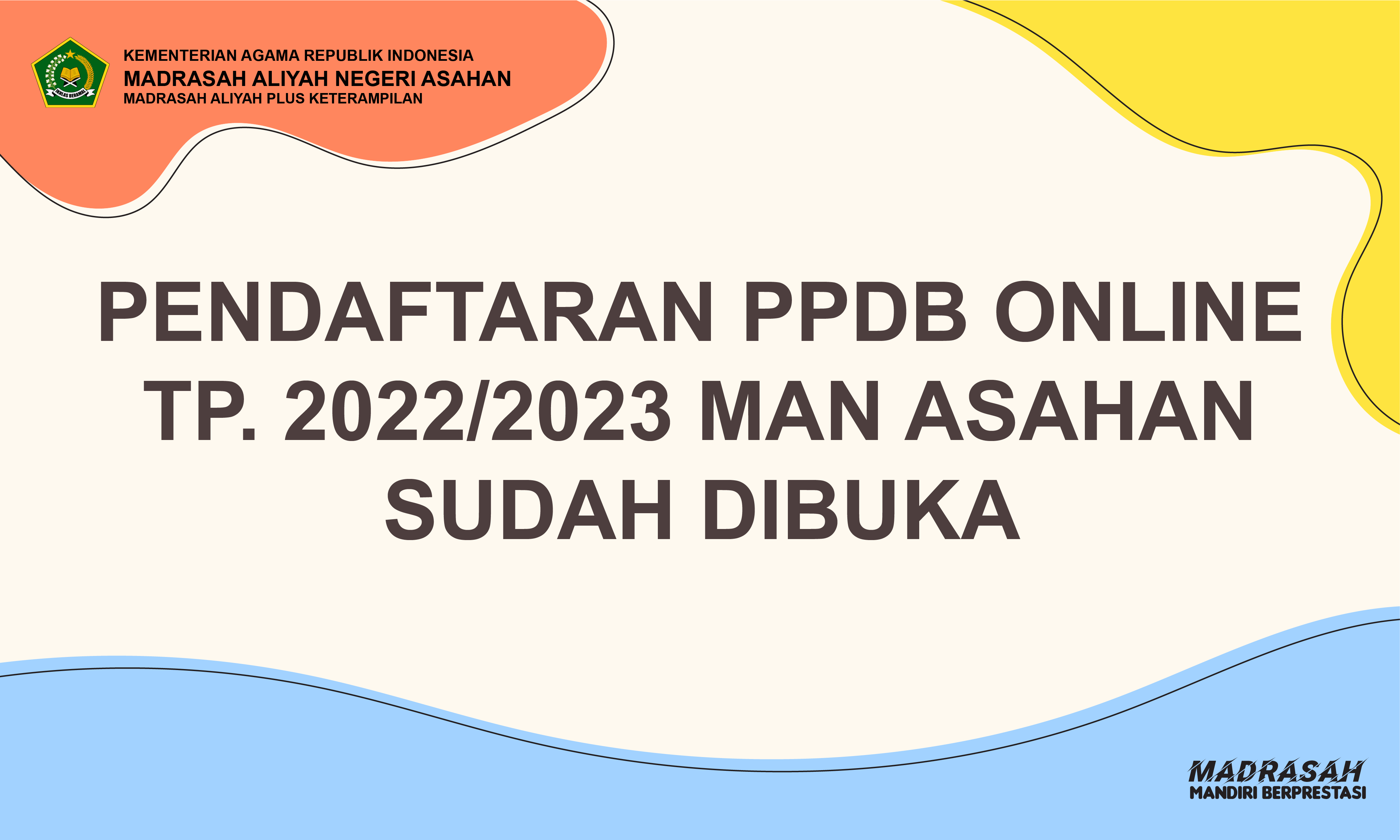 Pendaftarann calon peserta didik baru (PPDB) Tahun Pelajaran 2022/2023 MAN Asahan dimulai tanggal 10 Mei 2022 dan berakhir tanggal 14 Mei 2022 seseuai dengan jadwal yang sudah diumumkan sebelumnya melalui pengumuman di website dan juga brosur PPDB MAN Asahan TP. 2022/2023.