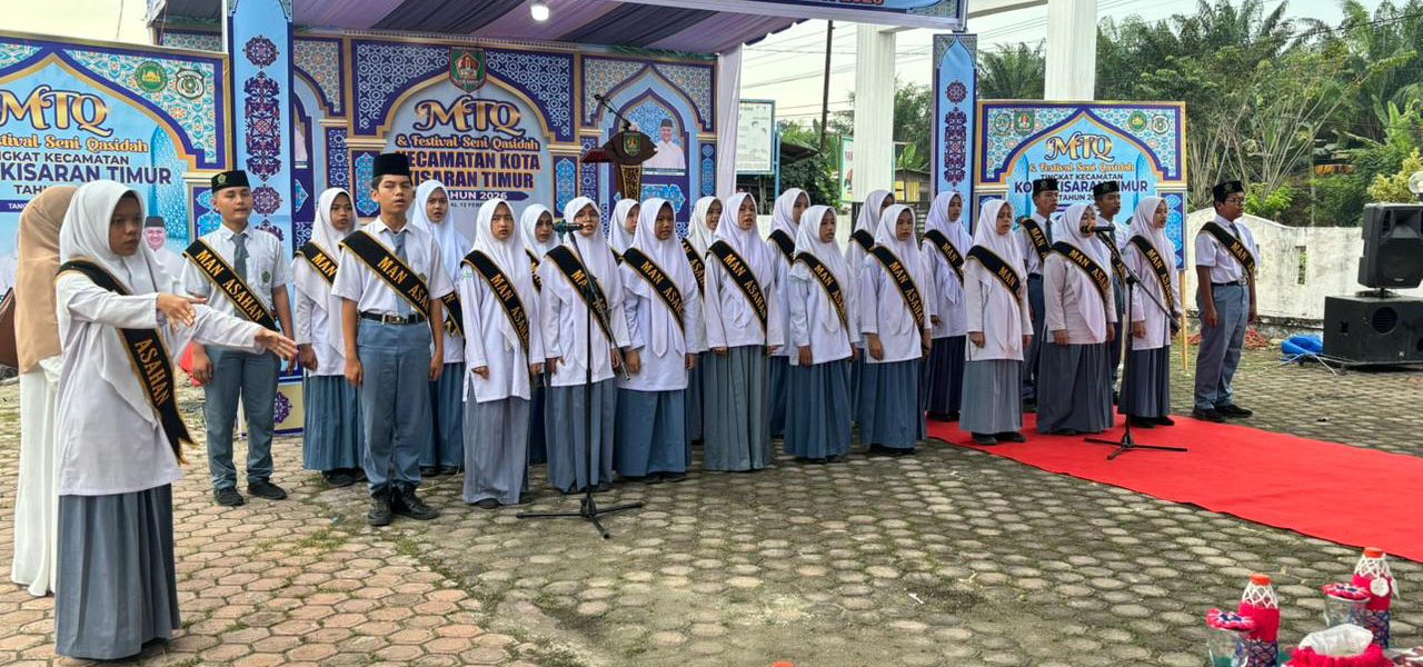 Kisaran (Humas). Tim Paduan Suara MAN Asahan yang terdiri dari 23 peserta didik tampil penuh semangat dan percaya diri saat berpartisipasi dalam pembukaan Musabaqah Tilawatil Qur’an (MTQ) dan Festival Seni Qasidah (FSQ) tingkat Kecamatan Kota Kisaran Timur. Kegiatan tersebut dilaksanakan di halaman Kantor Camat Kota Kisaran Timur, Jalan Ahmad Yani, Kelurahan Kisaran Naga, Kamis (12/2/2026).