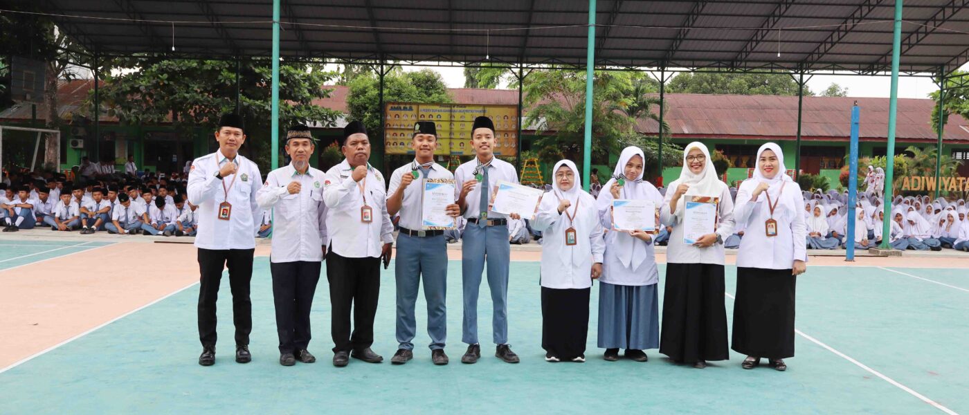 Kisaran (Humas). Kepala MAN Asahan Dra. Hj. Elda Ayumi, M.Si menyerahkan piagam penghargaan kepada para peserta didik yang meraih juara pada ajang Olimpiade Bahasa Arab (OBA) ke-8 Tahun 2025 tingkat Kabupaten/Kota yang diselenggarakan oleh Forum MGMP Bahasa Arab se-Indonesia pada bulan Juni kemarin. Penghargaan tersebut diserahkan kepada Nuraisyah Siregar (Juara I), Ihsan Maulana Aqwa (Juara II), Hafiz Khairul Azmi (Juara III) dan Wahyu Fahrudin Nazmi (Juara Harapan I) pada kegiatan apel pagi di lapangan MAN Asahan, Selasa (22/7/2025).