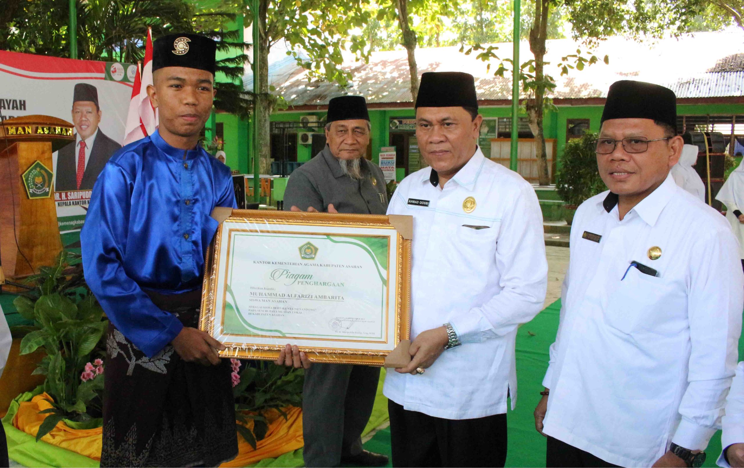 Kisaran (Humas). Adalah Muhammad Alfaridzi Ambarita peserta didik MAN Asahan kelas XII IPS 2 menerima penghargaan dari Kantor Kementerian Agama Kabupaten Asahan sebagai Siswa Bertalenta “Senandong” Pada Seni Budaya Muatan Lokal Di Kabupaten Asahan, yang pada kesempatan ini penghargaan tersebut diserahkan langsung oleh Kepala Kantor Wilayah Kementerian Agama Provinsi Sumatera Utara H. Ahmad Qosbi, S.Ag, MM.