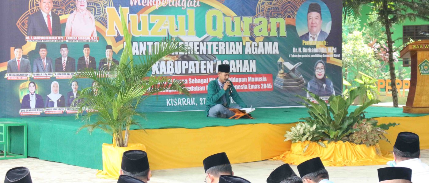 Acara peringatan Nuzulul Quran ini dibuka langsung oleh Kepala Kantor Kementerian Agama Kabupaten Asahan Dr. H. Saripuddin Daulay, M.Pd dengan menyampaikan tujuan dari peringatan Nuzulul Quran adalah untuk menyegarkan kembali ingatan kita tentang sejarah turunnya Al-Qur’an melalui Nabi Muhammad SAW dan membuka hati kita untuk menerima Al-Qur’an sebagai kitab kehidupan bagi seluruh manusia dan juga alam semesta.